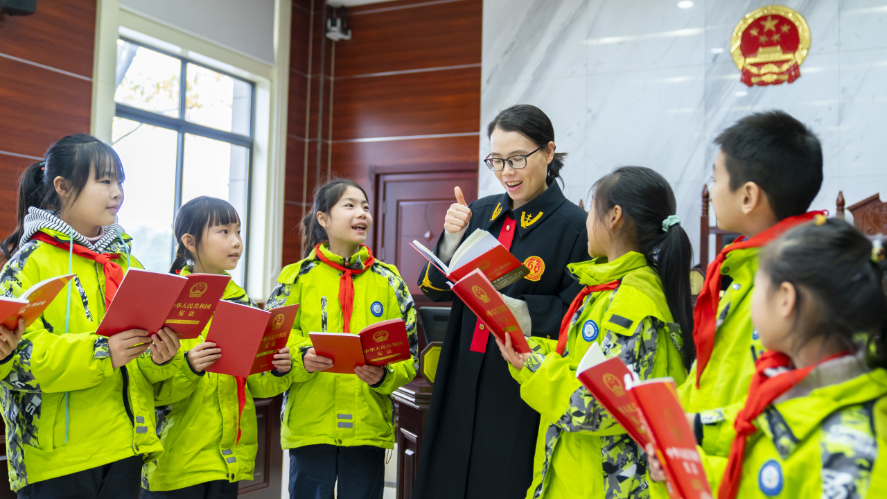 近日,长兴法院邀请泗安镇中心小学的学生走进法庭,近距离感受法律的威严和神圣。图为法官为孩子们领读宪法。(通讯员 俞冲)
