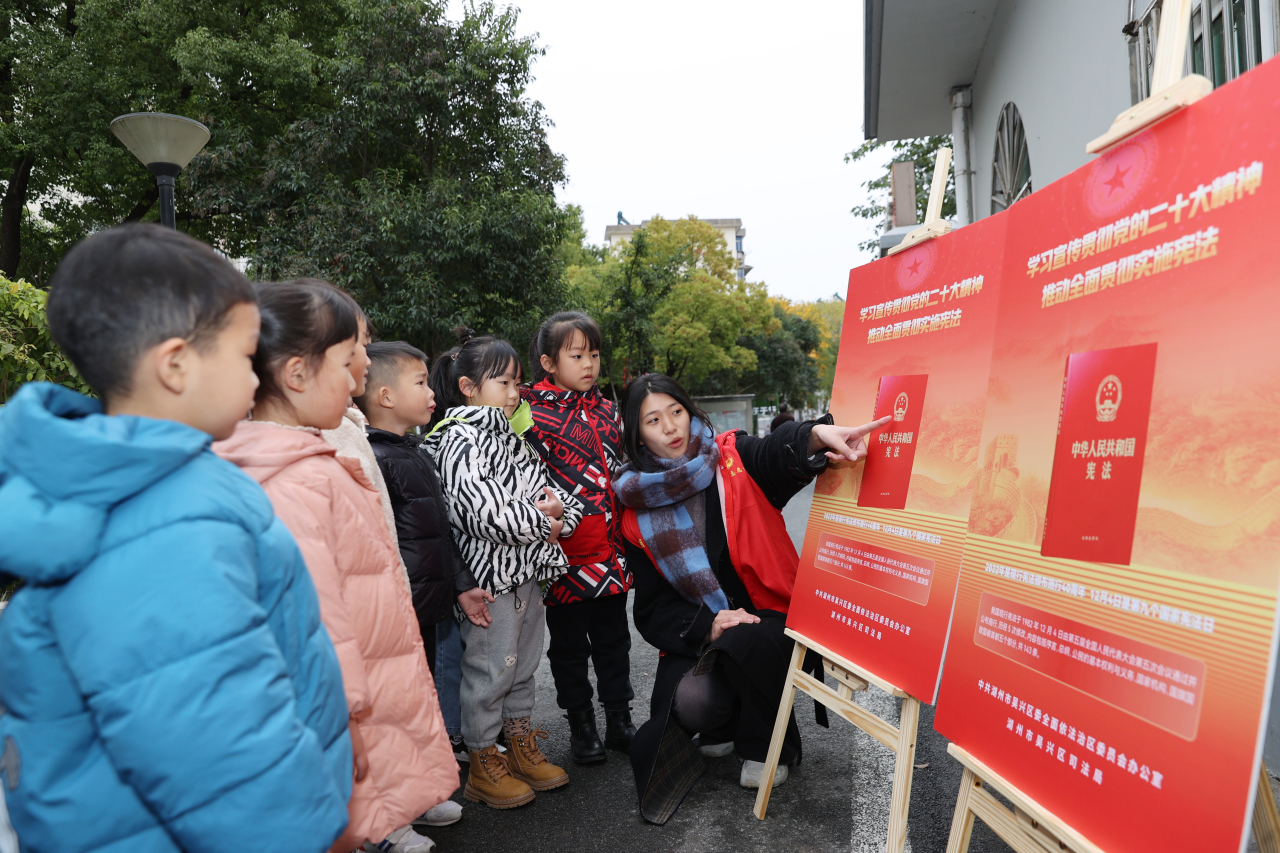 近日,湖州市吴兴区开展了丰富多彩的宪法主题宣传活动,增强群众的法治观念。图为志愿者给小朋友讲解宪法知识。(通讯员 何伟卫)