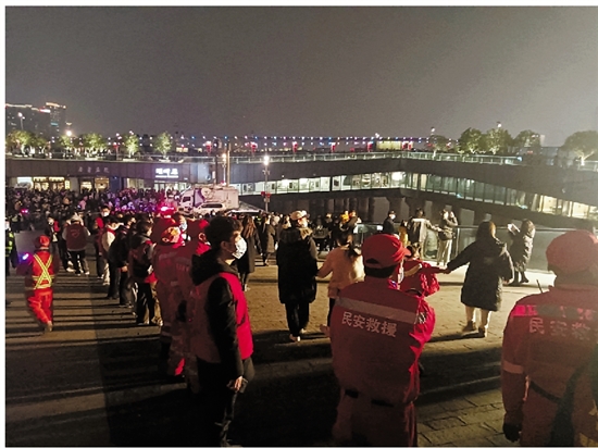 涌动的人群中,一群志愿者的身影格外显眼,他们身穿统一外套,全力维持秩序。“来来来,过道不要站人!”“请往右侧走,谢谢配合!”烟花大会散场后,城市阳台西侧坡道上,志愿者在过道中央组成一道红色“人墙”,引导观众有序离场,直到观众悉数离开。